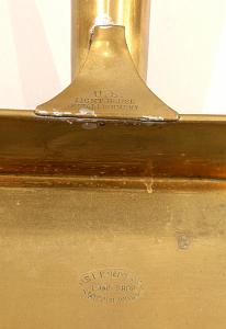 InformationOfficial brass US Lighthouse Establishment dust pan used by lighthouse keeper Judah Berry at Great Point Lighthouse, Nantucket, circa 1895. The dust pan has a typical triangular plate connecting the top of the dust pan to the handle. The plate has a stamped text U.S. Lighthouse Establishment and the base of the pan within an old border has the stamped text U.S.L.H. DEPOT 3, LAMP SHOP STATEN ISLAND N.Y. This all brass dust pan has a hollow brass tapered handle with a brass cap at the end with a 'D' ring hook. The pan has a brass back with two tapered brass sides which was the standard issue form provided to lighthouse keepers for American lighthouses before the Lighthouse Establishment became the Lighthouse Service in 1910. (I-886)