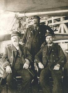 1.) Reproduction photo of Judah Berry and his two sons - Herbert Berry and Wilton (?) Berry. The three men are on a sailing vessel wearing USLHE uniforms. Lighthouse keeper, Judah Berry's sons were apparently captains on board lightship vessels. This photograph was taken by E. Paul Tilghman, a prominent African-American late 19th Century photographer from New Bedford.