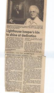 4.) An article from the Cape Cod Times September 6, 1986 titled 'Lighthouse Keeper's Kin to Shine at Dedication.' The article gives background information regarding Judah Berry and indicates he died in January 1905 at age 70 while climbing in the cast iron staircase in the lighthouse.