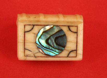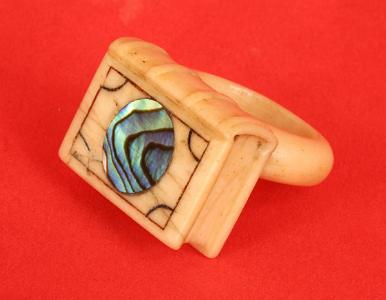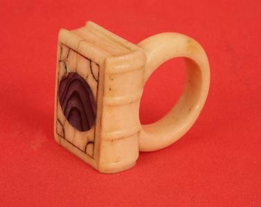InformationSailor made rare whale ivory scrimshaw ring, American mid 19th century. The ring has a beautfully carved book with incised bands on the spine. The top of the ring has and engraved border with an inlaid abalone disc inlaid at the center. (SC1070)