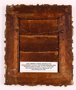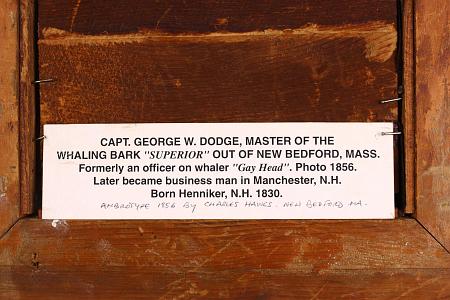 Note 1: George W. Dodge age and birthdate unknown was a green-hand on the ship Arnolda of New Bedford was captained by Captain Richard D. Wood 1848-52. Dodge was also either 4th mate or steward on the New Bedford Whaler Gay Head 1852-56. It is likely this picture was taken in New Bedford after he returned from this voyage. The ambrotype retains its original mat and gold leaf frame. The frame has a stepped liner and the outer frame is beautifully carved with a leaf and acorn pattern.