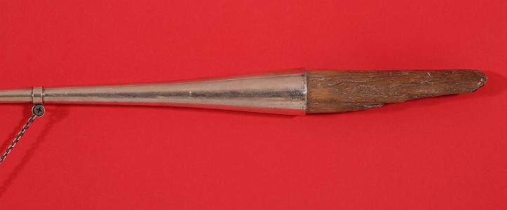 InformationCorinthian Yacht Club silver double fluke harpoon yacht prize manufactured by Whiting Mfg. Co. of New York. At the top of the trophy, there is a silver ring with a pair of silver chains attaching to small rings applied to the top of the harpoon shaft. There are two shorter chains attached to a silver oval like plaque with raised lettering which states “C.Y.C. of N.Y. Fourth Annual Sweepstakes. Newport. R.I. 2nd Prize. August 22d 1892. Wasp 1st – Harpoon 2d. Gloriana." The harpoon is very accurately formed to replicate an authentic double fluke harpoon. There is a broken snub shaft at one end of the harpoon giving the appearance that the harpoon was broken off by the whale. The end of the shaft near the wood is stamped “Sterling 4098." The same silver mark appears on the bottom rear of the raised lettered plaque. (MI-815)