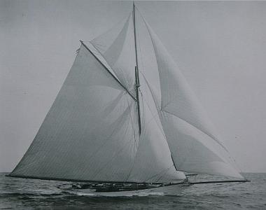 Note 1: The Yacht "Harpoon" belonged to the 46 footer class which began in 1891. The Harppon was designed by Edward Burgess and built by A.J. Frisbee of Salem in 1891. She was originally named "Beatrix" and was sold to the Adams brothers of Boston. They refitted her for the racing season of 1892. The changes included a new sail-plan and a weighted centerboard designed by Stewart & Binney. The success of the alterations was proven by the fact that the "Harpoon" beat the previous winner "Gloriana" in five straight races , by a margin of nearly 5 minutes in each race. Harpoon also won the 1892 Goelet Cup for sloops, defeating both "Wasp" and "Gloriana."