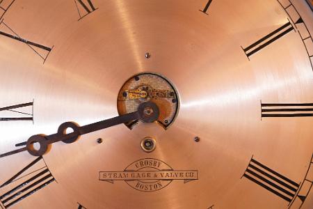 InformationExceptionally Fine and rare Ship's Clock, signed Harvard Clock Co., Boston on movement, circa 1895. The clock retains its original 12 inch silver dial. The dial has beautifully engraved Roman numerals which are wax filled. Below the center mount winding arbor is the retailers label signed: "CROSBY STEAM GAUGE & VALVE CO. BOSTON". Above the winding post is an almost circular aperture or cut away in the dial, exposing the engine turned movement plates. One can also see the beautifully hand-engraved balance wheel mount with slow/fast adjustment. The clock retains its original hands. The clock retains its original bronze case with a deep dish hinge bezel with a beautifully applied shield style hinge. The eight day movement is in good running order. (Cl-0006) Note: The Harvard Clock Company was a predecessor to the Chelsea clock company. The clocks are quite rare, particularly clocks with the exposed escapements. This is the only example known with an exposed escapement and a 12 inch dial. The other known examples have smaller dials, usually 5 1/2 inches. This clock is among the most desirable and rare of American ship clocks. Condition: The dial retains its original silver and has scattered discoloration. The case has been polished and lacquered in 1980. Dimension: Diameter 14 1/4 inches; Depth 3 1/4 inches.