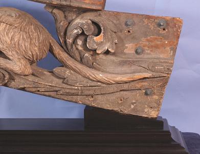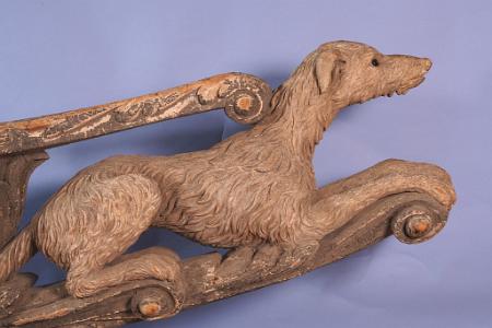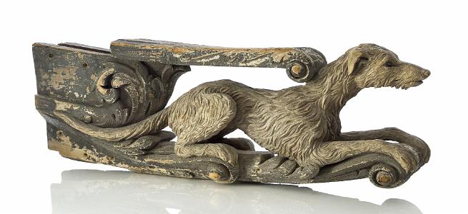 InformationTHE FIGUREHEAD OF THE YACHT GELERT, R.Y.S., CARVED BY JAMES HELLYER OF HELLYER & SON TO THE ORDER OF R. & M. RATSEY'S YARD, WEST COWES, 1867 Realistically carved in lime wood as a full-length crouching wolfhound waiting for a command, his head alert with inset brown glass eyes looking up, mounted on a scrollwork bow section with thole pin and securing holes and finished in contemporary silver-grey polychrome. There are few figureheads know with glass eyes and this is the only one known from the Hellyer carvers. Dimensions: 17 x 54 x 9in. Provenance: Aboard Gelert, 1867-1891; Ratsey's Yard, Isle of Wight, 1891-c.1960s; Digby Coventry (1919-2014), acquired from Ratsey's dispersal sale on closure, c.1960s, and thence by descent. The Hellyer family of carvers became famous for their carvings used by H.M.S. Warrior and the Cutty Sark, but had been active as mainly Naval Dockyard carvers for about 400 years before these commissions. Listed in contemporary directories as 'designers' as well as carvers, their name is a byword for quality, a fact that is readily confirmed by the exquisite handling of the example offered here. It is comparatively rare to know the name of the vessel a head was intended for and very rare to know the name of its designer and carver, confirmed in this case by an inscription added to the reverse of a contemporary photograph of this head used in the book British Figurehead & Ship Carvers by P.N. Thomas where it is stated to be inscribed By James Hellyer, carver to the Royal Navy. The reportedly “fine schooner yacht” Gelert was built for Colonel Edward Loyd, a prominent member of the Royal Yacht Squadron, by Messrs. R. & M. Ratsey at West Cowes and launched from their yard by Mrs. Sandford, Colonel Loyd’s cousin, on 18th April 1867. Named for the legendary dog “Gelert” from Welsh folklore, the yacht was registered at 168 tons gross (94 net) and measured 98 feet in length with a 20 foot beam. Sporting the particularly distinctive figurehead being offered here, she attracted attention wherever she went but Loyd soon tired of her and she was laid up in 1870 and replaced with a 92-ton yawl called Day Dream. After ten years of idleness, Gelert was finally sold to Charles Howard, 5th Earl of Wicklow (in 1880) who unfortunately died the following year and was succeeded by his brother Cecil. Cecil Howard, the 6th Earl, like his deceased brother, was also a member of the R.Y.S. and he raced Gelert until 1889 when she was again laid up pending sale. Late the following year (1890), the Gelert was lying in the Medina River awaiting a buyer when she was spotted by Prince Henry of Battenberg, an enthusiastic yachtsman who was looking to replace his 62-ton yawl Sheila with something larger. Instantly attracted to Gelert’s fine lines, Prince Henry bought her and, on 29th January, 1891, the Isle of Wight newspapers reported that: “Prince Henry of Battenberg’s recently-purchased schooner, the Gelert, has been re-named the Sheila, after his old yacht, and she has undergone a complete refit at Cowes, which has been finished by placing a new figure-head on the vessel, which takes the form of a bust of Princess Beatrice.” As stated so clearly in this newsprint, the beautiful figurehead of the dog Gelert had been removed and put into storage where it remained until purchased by the present owner’s grandfather in the 1960s. Replaced by a bust of Princess Beatrice, herein lay the simple reason for the survival of this splendid figurehead in such exceptional condition. Prince Henry of Battenberg, born in 1858, was a morganatic descendant of the (German) Grand Ducal House of Hesse and was a familiar visitor to England and Queen Victoria’s extended family, so much so that in 1884 he became engaged to Princess Beatrice, the Queen’s fifth daughter and youngest child. The Queen however, would only approve the marriage provided the young Battenbergs made their home with her and the couple had no option but to agree. Married in 1885, Prince Henry was made Governor of the Isle of Wight in 1889, an event which probably sparked his desire for a larger racing yacht. Sadly, Prince Henry, having finally persuaded the Queen to allow him to go to West Africa to take part in the so-called Ashanti War, died of malaria during the campaign in January 1896. When the news reached the Queen, she is said to have cried out “The sunbeam in our home is GONE!”, and whether this is true or not, the Prince’s beloved yacht Sheila, formerly the handsome Gelert, quietly disappeared from record thereafter. The Legend of Gelert the Dog by Ben Johnson One of the best known, and loved, folk-tales in Wales is the story of a faithful hound. The story goes that in the thirteenth-century, Prince Llywelyn the Great had a palace at Beddgelert in Caernarvonshire, and as the Prince was a keen hunter, he spent much of his time in the surrounding countryside. He had many hunting dogs, but one day when he summoned them as usual with his horn, his favourite dog Gelert didn’t appear, so regretfully Llywelyn had to go hunting without him. When Llywelyn returned from the hunt, he was greeted by Gelert who came bounding towards him …his jaws dripping with blood. The Prince was appalled, and a horrible thought came into his mind …was the blood on the dog’s muzzle that of his one-year old son. His worst fears were realised when he saw in the child’s nursery, an upturned cradle, and walls spattered with blood! He searched for the child but there was no sign of him. Llywelyn was convinced that his favourite hound had killed his son. Mad with grief he took his sword and plunged it into Gelert’s heart. As the dog howled in his death agony, Llywelyn heard a child’s cry coming from underneath the upturned cradle. It was his son, unharmed! Beside the child was an enormous wolf, dead, killed by the brave Gelert. Reference: British Figurehead & Sip Carvers, by P.N. Thomas, Published by WAINE RESEARCH PUB