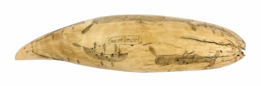 WHIMSICAL SCRIMSHAW WHALE'S TOOTH with Whaling Scenes, Second Quarter of the 19th Century