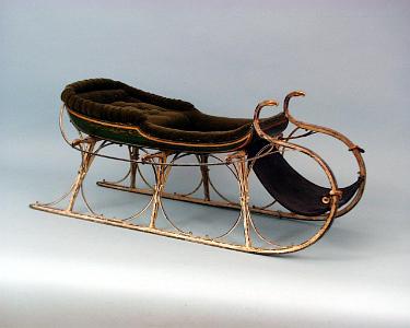InformationExtremely Fine and Important Child's Sled, with eight carved and gilted eagles. The sled is beautifully polychromed and retains most of its original paint. The sled pulls are ivory and possibly whale's tooth. The sled has a new upholstery green velvet mohair seat. (CR5009)) Dimensions: Length 42 inches; Width 22 1/2 inches; Height 18 inches.