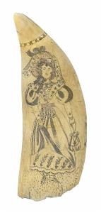 InformationScrimshaw whales tooth depicting 1st Rate British 120 Gun Navel Vessel on the obverse. The ship has the stern facing the viewer and it angles away from the viewer showing the 3 rows of cannon. The spars and rigging are highly detailed as are the stern and 1/4 galleries. The ship is flying the English flag from the gaff. The reverse and a beautifully rendered portrait of a standing woman in a formal dress and fancy bonnet. There is some red color embelishment in her belt and bonnet. Their are a narrowly spaced pair of lines going around the tip with engraved stars between the lines. (SC1184)