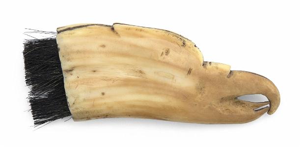 InformationWalrus Ivory fine detailed carved eagle head with a pearl eye. At the open end of the walrus tusk bristles are affixed to base for use as a brush. The back side of the eagle is uncarved and finely polished.