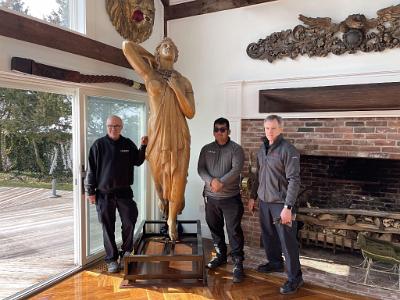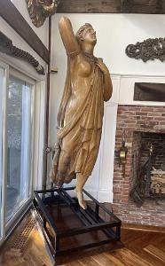 Information Carved and painted figurehead from the Donald McKay Clipper Ship "Glory of the Seas" in the form of a classical goddess carved by Herbert Gleason in Boston in 1869. Gleason is best known for his figurehead for Donald McKay’s “Glory of the Seas”. “Carved in 1869 she stands on her toes, clutching, loosely flowing drapery between her breasts. Generally Classical in Conception, she wears a necklace and armbands that also reference American Indian adornment. The work is well done and the figure is convincingly articulated. What is particularly striking though, is the extent of her nudity. Her bare feet, ankles and arms, combined with her exposed breasts are extremely rare for an American Figurehead. At the time public opinion was finally coming to accept nudity in the private realm of the fine art gallery or collector’s home." (Reference 4: Text by Ralph Sessions) Provenance: Prior to the destruction of the of "Glory of the Seas" in 1923 the figurehead was removed and saved. It was acquired by James A Farrell a major collector and President of US Steel. He was one of the founders of India House to whom he eventually gave the figurehead. The wood plaque with gold painted lettering was exhibited below the figure. James Farrell in 1927 wrote the foreword to the Book "Some Famous Sailing Ships And Their Builder Donald McKay" by Richard C. McKay who in the preface (P. vii) wrote "Mr. Farrell has always been interested in Donald McKay and his ships, especially the "Glory of the Seas", which his father Captain G. Farrell commanded and with whom in his youth, he sailed around the Horn. Almost 100 years later the figurehead was removed from India House with the plaque in 2021 and was sold privately. Condition: The figurehead is in excellent original condition. The painted surface going back to when she was mounted at India House. The brownish natural wood color has a crackled surface. There are a few age cracks and the right foot has been repaired. Height: Approximately 8 6" feet: Weight: Approximately 460 pounds THE VOYAGES OF GLORY OF THE SEAS 1870 - 1885 (Wikipedia) On her maiden voyage, Glory of the Seas sailed from New York in February 1870 under the command of Captain John Giet. She anchored at San Francisco on June 13 after a passage of 120 days. From there she sailed to Liverpool, England, under Captain William Chatfield. McKay then sold Glory to J. Henry Sears of Boston, who replaced Captain Chatfield with Josiah Nickerson Knowles. Details of her time between 1870 and 1885 are incomplete, but she "ran between New York and British ports and San Francisco almost exclusively" during those years. She did make a fast voyage from New York to San Francisco between October 13, 1873 and mid-January, 1874. In 1875 she set the record of 35 days for a passage from San Francisco to Sydney, Australia. According to McKay, until 1885 under Captain McLaughlin “Glory” carried general cargo from New York to San Francisco and wheat from there to Britain, and was nearly wrecked in a storm when arriving in Britain in 1880. The Bruzelius timetable differs and does not mention the 1880 event. Both agree that she was laid up at San Francisco between December 1882 and February 1885. The Peabody Essex Museum has a photograph by W.H. Black of thy launching of "Glory of the Seas" in East Boston. McKay appears at the center of the photograph wearing a top hat. After 1885, “Glory of the Seas” spent the rest of her long life on the Pacific coast, for a time sailing between San Francisco and Puget Sound and occasionally to Alaska. In March 1906 she was sold in San Francisco for conversion to a barge but was repaired after the April earthquake and "put under sail again". Note: Lloyd McCaffrey a world renowned miniature ship model builder for years had a side interest in creating sub miniature carved figureheads of historic vessels. He stated in the description he wrote regarding his miniature carving of the “Glory of the Seas” figurehead that the “Glory of the seas was at the pinnacle of American ship’s figureheads. He also mention that Michael Jay Mjelde an authority on the “Glory of the Seas” and author of three books about the vessel stated the resulting from the severe exposure to the waves and salt air the ship endured in her many around the world voyages it was necessary to replace her raised right arm which extended off the main body of the figure resulting in greater exposure and damage then the rest of the figure. Period Account of Glory from her last years.: In 1911 she was stationed at Ketchikan during the summer months and became the feature in an article published in the periodical Outlook. A writer/photographer visited Glory and in doing so not only photographed the figurehead but wrote a text in which he wrote his personal impressions which is one of the best that I have seen in which the writer viewed the actual figurehead mounted on the ship following which he wrote his text. It read as follows: “The Glory of the Seas at the wharf at Ketchikan, her topgallant masts down, her jib-boom gone, and only one stick left of the crowding yards that had once carried her clouds of canvas. “’Going to take a picture of the lady?’” someone asked, as I set up the tripod. “Under the stubby bowsprit…was poised one of the finest figureheads I have ever seen. He must have been something of an artist who carved ‘the lady,’ for her face was comely and strong and good, and there was dignity in her air, in spite of the evil days she had fallen on…there floated under her aristocratic nose a stream of fish refuse that came from the Glory’s own scuppers…" Michael Jay Mjelde Height: 8 feet Weight 460 pounds approximately During my research, I came across an old newspaper article describing the transformation of the clipper Glory of the Seas into a salmon cannery. In this article, an old sailor named a fetching woman of unusual beauty, Elizabeth le Forgue of East Boston, 