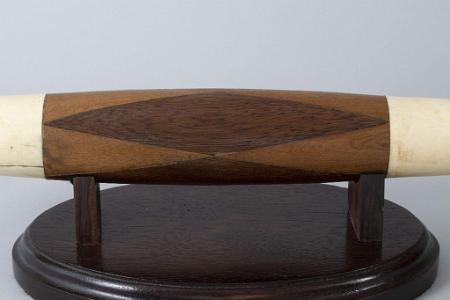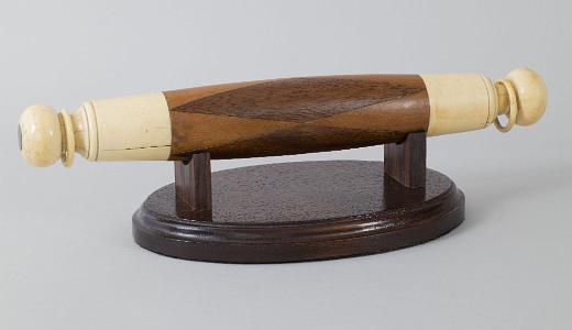 InformationWhale Ivory and exotic wood scrimshaw rolling pin, American circa mid-19th Century. The opposite end of the rolling pin are made from whale ivory the are 2 3/8 inches in length. The ends of these sections are bulbous in form with inlaid tortoise shell inlays at the back ends. The inside of the ivory ends have perfectly rounded ivory rings that float and turn freely around a narrow part of the handle end. These rings are sometimes referred to as mystery rings because it is difficult to understand how they were placed there. We have never seen mystery rings created for a rolling pin before. There is a 6 5/8th inches section of exotic wood cut in full length diamond fallowed by opposing lighter colored wood triangles. There are four of each type of section going around the circumference of the rolling pin. (SC1215)