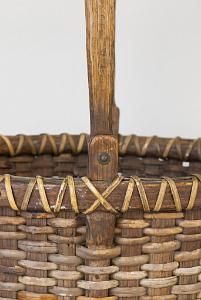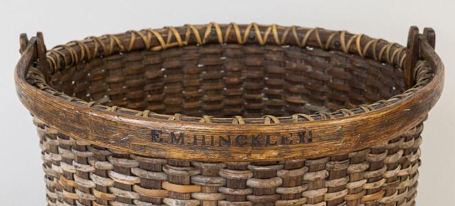 InformationFine historically interesting Large (13 inch diameter) Nantucket work basket with carved oak handle which has the name “E.M. Hinckley” carved in block letters at the top of the handle circa 1865. The basket has oak ribs and is woven with a heavy and strong cane with circular wood base. This is a fine and very early basket.It is one of the finest large and early Nantucket work baskets I have examined. (B 0190)