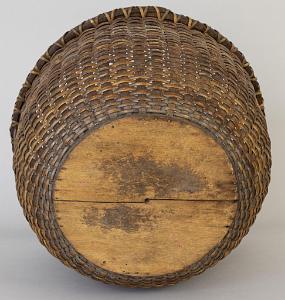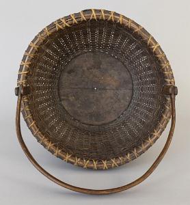 Condition: The basket is in fine condition The weave is tight and there are no breaks. The basket has a warm deep patina and based on the ware shown on the bottom of the base it looks as though it saw a lot of use. There is a split in the wood base.