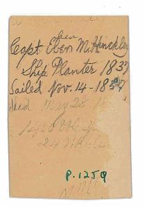 Note 1: In an email dated September 17, 2022 from Marie Henke Researcher for the Nantucket Historical Association she reports the information she had gather regarding E.M. Hinckley (1805- 1885. One interesting fact she found was that Captain Hinckley was of many Nantucket Pioneers who sailed from Nantucket on board the Ship Martha arriving in 1849 to find their luck in the California gold rush. Marie Henke mentioned that there was a lot of information about Hinkley in the Historic Digital Newspaper Archives on the Nantucket Atheneum website under Reference. There were are 35 articles that mention him including: that he was a coroner in 1838; a surveyor of lumber in 1855, and that he exhibited various produce and livestock at the island Agricultural fairs from 1857-1883. She found that Eben Hinckley was born in 1805 and died in 1885. Also Ebenezer M. Hinckley was a captain out of New Bedford whaler from 1833-1837 to the Pacific ocean. This voyage was fallowed a voyage to the Pacific on board the Nantucket Ship Planter 1837-1841. In the collection of the NHS is a Cartre -De Visite photograph circa 1850s of Eban M. Hinckley (PH168).