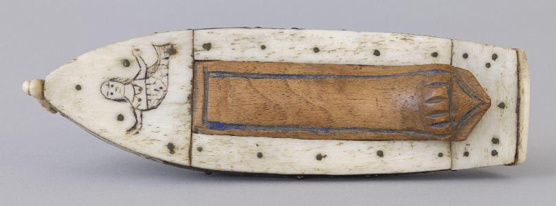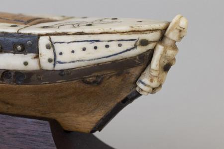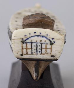 InformationHandsome and Rare POW box, carved in the shape up a ship’s hull, English circa 1800. The hull has 2 applied strips of baleen between a bone strip applied with tiny fastenings. At the bow are carved and scribed bone trail boards with a carved bone figurehead of a full-figured woman. The top of the box has four pieces of bone covering the top surface. At the bow section on the top is a scrimshaw like engraved image of a mermaid with open arms. There is a raised carved piece of wood which hinges forward providing access to the snuff storage area below. The box sits on a carved mahogany base mad at a later date than the box. (FA1121)