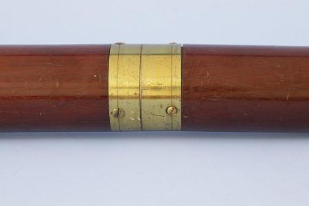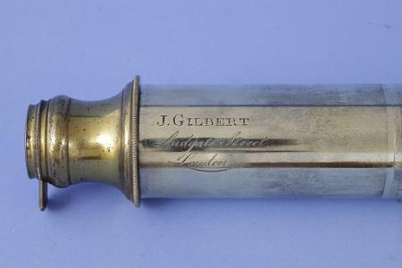 InformationA very large two-part, 3” tapered single draw telescope with mahogany barrel signed on the draw tube J. Gilbert, Ludgate Street, London circa 1778. The telescope has a typical bulbus eye piece retaining the original dark slide. The draw tube has the eyepiece at one end and there are five other lens elements in the tube. The draw tube screws apart at the point where each of the lenses is set so they can be cleaned. At the center is a 2-part heavy brass threaded fitting allowing the telescope to tread apart into 2 more manageable sized parts. The objective lens is held within a round brass fitting at the end of the scope and has no lens cap. The telescope measures 3 inches in diameter at the front lens end and 3 inches at the eyepiece end.