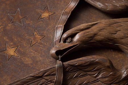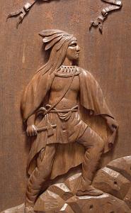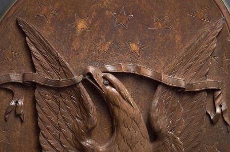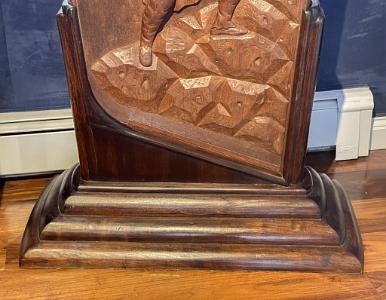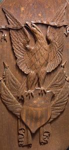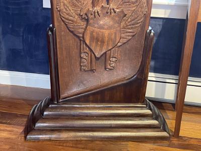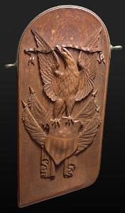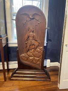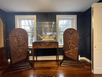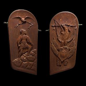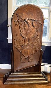 InformationExemplary pair of mahogany carved gangway boards that were probably used on board a vessel of the United States Navy attributed to the master carver, John Hale Bellamy. Gangway boards were large decorative plaques that lined the opposite sides of the ship’s gangway (the walkway providing passage to the ship) located around the middle of the hull. Each of the matching gangway boards has the typical shape with an arched top, lined with brass with applied brass “rope rings” on opposite sides. Each carving is rounded on one bottom corner and straight on the other. One gangway board has a deep raised carved eagle perched on an American shield flanked by two carved American flags, above draped curtains at the bottom. The other has a deep relief carved spread winged eagle with carved wavy ribbons flowing from each talon and a large carved Indian warrior below standing on rocks holding a tomahawk. All the uncarved flat surfaces of the gangway boards have a stipple even surface throughout. This is a method Bellamy used on the the pairs of gangway boards he made for the USS Enterprise and other carvings with flat surfaces. The eagle and shield gangway boards has many distinctive features. The left facing gangway board features an eagle perched on the shield and has several distinct details. Above the eagle is an array of incised five pointed stars and on the sides below the wing tips are additional stars totaling 13. All the stars internal surfaces are smooth which contrast with the stipple surface surrounding them. The eagle’s left facing raised head is very well articulated with raised detailed eye and pronounced brow that sweeps back from the eye and down the neck with a defined open beak holding a folded ribbon that expands left and right and then turns down and has a split end. The eagle’s wings are raised and the carved feather on the wings is stylistically different in style than the feather carving on the neck and chest. The legs have similar style leg feathers, and the tail feathers are carved at an angle and located behind the right leg. The eagle’s claws and talons are raised clutching the top of the American shield. The shield has a serpentine shaped top and sides that wind around and come to a point at the bottom. The shield is divided into two sections with an incised double band. The top section features 13 smooth five-pointed stars. The lower section has 12 vertical stripes with alternating dark and light stained sections. The surface of the shield has a slight wave like roll to its shape going from top to bottom. Flanking the shield are a pair of American flags set an angle facing out. Each flag has a spear shaped pediment with a draped pair of cords with tassel ends. The canton of each flag has multiple rows of five pointed stars. The flag is folded and the stripes with light and dark adjacent stripes wrap around and terminate along the surface of the shield. Below the shield are a pair of draped and folded raised carved curtains. The right facing gangway board features at the top a spread winged eagle with his neck turned facing left. The eagle’s head is well detailed with highbrow with defined eye and beak. The beak is holding a ribbon that flows left and right and then turns down with split ends. Encircling the eagle are 13 incised five-pointed stars similar to the stars on the other gangway board. Below the eagle is a deep relief carved figure of an Indian warrior holding a tomahawk and standing on a hill of carved rocks. The Indian is wearing a detailed bear claw necklace and a feathered headdress. This pair of gangway boards have the finest quality of carving and subject matter. The carved eagles, Indian, patriotic flags and stars classify these carvings as excellent examples of patriotic American folk art and at the pinnacle of the ship carvers art. Reference 1: “American Eagle The Bold Art & Brash Life of John Haley Bellamy” by James A. Craig, published 2014 by Portsmouth Marine Society Publication, number 34. pages 71-75. Pictured are two pairs of gangway boards by Bellamy from the USS Enterprise. One of the larger boards has the ship’s name “ENTERPRISE” near the rounded top. There are many very similar carved themes and similar carving techniques to the gangway boards described above. Reference 2: “John Haley Bellamy Carver of Eagles” by Yvonne Brault Smith, published by Portsmouth Marine Society, publication I, 1982, page 36 shows a photograph of Bellamy’s studio. In the photo is a Bellamy eagle with wings up, head turned, and below an American flag and shield. The composition very similar to the eagle on the left flanking gangway board. (FA1141) Condition: Dimensions: Height 49, Width 29, Depth 3 ¾ inches Provenance: Collection of the late Rear Admiral Richard A. Kern (1891-1982) Dr. Richard Arminius Kern received his medical degree from the University of Pennsylvania in 1914. He served in World War II in the South Pacific and was involved in the battles of the Coral Sea and Guadalcanal. He ended his service on the staff of Admiral Halsey as Chief of Medicine and Rehabilitation at the Naval Hospital of Philadelphia. Kern was active in the Naval Reserve and served the Department of Defense on a number of missions and key committees. He was president of the Society of Medical Consultants in the Armed Forces and the Association of Military Surgeons of the US. Two portraits of him are included with the photos of the gangway boards. Attribution: The following information regarding Bellamy's ship carving of gangway boards and work for the US Navy should make the case very clear that there is a very strong probability that the naval gangway boards described above were created by John Hale Bellamy around 1860-1875, for an unknown naval vessel while he was working at either the Charlestown or Portsmouth Navy Yards. Almost all of Bellamy’s associations throughout his life were or had been linked with the US Navy. Bellamy spent the ent