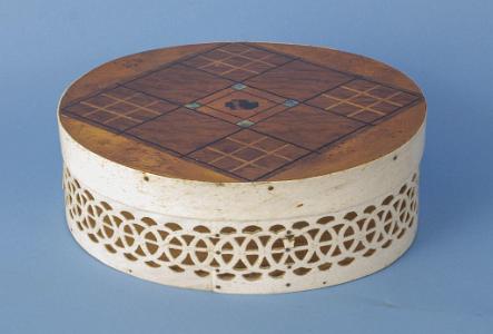 Reticulated Oval Whale Bone Ditty box with Marquetry Wood Top, American circa 1870