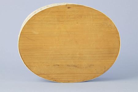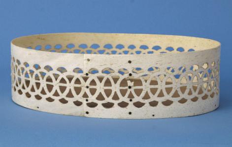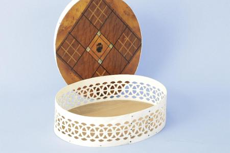 InformationExtremely fine Reticulated oval whale bone ditty box with marquetry wood top, American circa 1870.The top of the box has a thick wood top with a vey wavy grain. The four sides of the oval have a light bird’s eye maple veneer. The center diamond shape has wood without the veneered sides and the same wavy grain shows on the bottom of the lid. There is a small oval piece of bird’s eye maple inlaid at the center of the bottom of the basket top. There is a grid of thin black inlaid black wood forming a checkered design on the top of the basket top, each of the four corners has a light wood inlaid “tic-tac-toe” pattern. The center has an inlaid Maple square with black border inlay with a small tortoise shell inlay with small abalone inlaid corners. The middle four boxes are natural wave patterned wood The top has a whale bone lip with a height of one inch. The bone is steam fitted around the oval top and is joined with a saw tooth jagged edge which is metal pinned at the bone overlap. The base of the basket has a wood bottom which was steamed fit the whalebone basket sides with a height of 2 5/8 inches. The perimeter of the bone has a very fine interlocking circle pattern. Above and below the circles is a small fan like piercing in the bone which adds to the look of the overall design. The whale bone sides of the basket have about a 1 ½ inch overlap and there are two rows of five metal pins fastening the bone sides together. (SC1263)