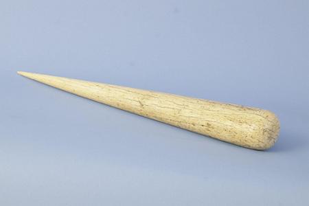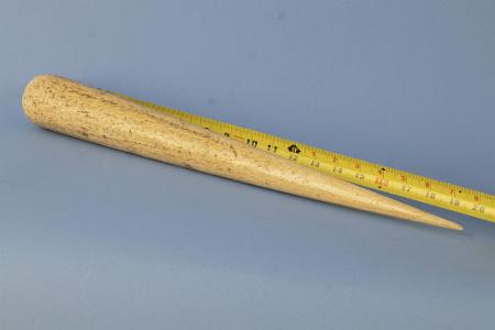 InformationExtremely long thick and heavy whale bone fid, American 19th Century. The fid is very thick at the butt end and gently tapers to a tip at the opposite side. The bone is very dense and has an attractive grain or surface. Condition: The fid has scattered surface age cracks which add to the mellow patina of the piece. There is a slight tiny loss at one side of the tip. (SC1264) Dimensions: Length 20 1/8, Thickness 2 1/4, Inches