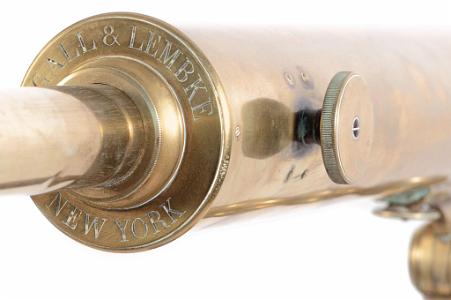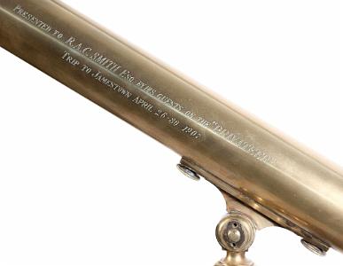 Engraved on side of tube "Presented to R.A.C. Smith Esq. By His Guests on the 'Privateer' Trip to Jamestown April 26-30, 1907". Retains brass lens cap. Marked "Gall & Lembke New York" on the back plate and signed Bardou & Son Paris on the draw tube.. Original hardwood tripod with brass swivel mount and central brass post that adjusts telescope height via a brass and wood hand crank. (I- 0988)