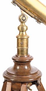 Condition: The telescope is in excellent condition and has a mellow patina. The telescope focuses and brings up a sharp image with about 50 power. The Height adjustable tripod raises and lowerers by turning the and metal crank on the top of the stretcher and it is in good working order. Telescope has been professionally polished and the wood has been waxed.