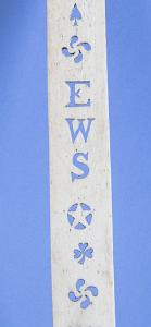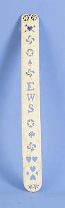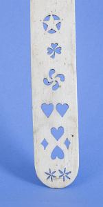 InformationFine pierced whalebone busk with pieced decoration. The top of the busk has the shape of the top of a heart with pierced pinwheels at the top corners, American, circa 1870. There are several other pierced decorations including stars, hearts, a spade, and a three-leaf clover. At the center are larger carved out initials with the letters “EWS”. At the bottom is another pair of pin wheels. (SC1284)
