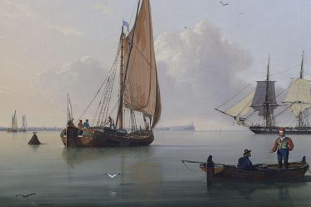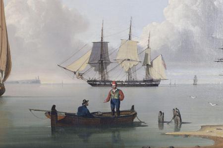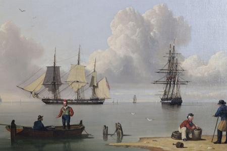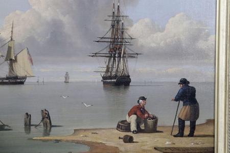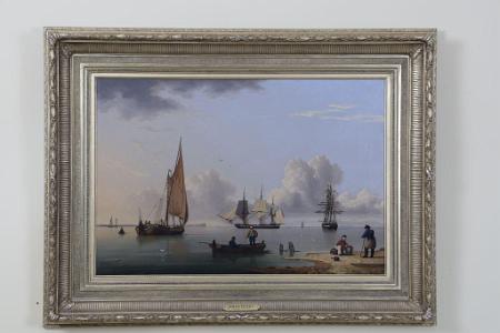 Information Ward, John English 1798-1849 Oil on canvas, titled: "A Frigate Offshore", signed and dated lower right J. Ward 1831 on a floating board.The painting is a wonderful seascape with shipping. In the foreground to the right is a small area of beach. There is a seated figure handling objects in a basket while apparently in conversation with a standing fisherman holding a cane. To their left is a rowing craft apparently at anchor. In the boat there is one figure seated and a second figure is standing, and both figures appear to be having a conversation. The detail and colorful clothing which the figures are wearing are painted with outstanding detail. At the center horizon is a frigate in a hooved-to position. A stern view of the same vessel is shown to the right. To the left is a latine rig fishing vessel. Along the left hand side of the horizon is a spit of land with twin lighthouses at its termination. This point of land is known as Spurn Head which marks the entrance to the River Humber which leads to Hull. In the background there are various vessels and birds. The detail and crispness of this painting displays the mastery of John Ward. To the bottom right is a board laying on the beach which bears his signature and the date 1831. (PA-244) Reference I: "John Ward of Hull Marine Painter 1798-1849", The Ferens Art Gallery, Queen Victoria Square, Hull 1981. This painting is illustrated as Plate 13 on page 35. The description in the book is incorrect relative to the dimensions and medium. "This is almost certainly Ward's academy piece for 1831". Reference II: Archibald, E.H.H., "Dictionary of Sea Painters", Antique Collectors' Club Ltd., 1980, p. 197. Ward, John 1798-1849 "Born in Hull, December 28th, 1798, he was the son of a master mariner of Hull and was apprenticed as a house and ship painter, a trade he followed all his working life, even though he had also become a successful artist, who remains the best known and most admired of the Hull School of marine painters. He was influenced by William Anderson and copied some of his pictures." "He exhibited at the Royal Academy between 1840 and 1847, and at the British Institution between 1843 and 1847." "Ward also made engravings of many of his own works, which were published. Some of his most successful compositions are Arctic Scenes, of which he had first hand knowledge from sailing with the whaling fleet." Condition: The painting has been recently conserved. It has been lined and placed on a new stretcher. There is very minor specks of scattered inpaint. Dimension: 20 x 28 1/2.