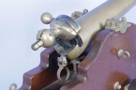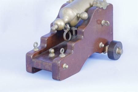 8 gauge Brown signal cannon, Connecticut, circa 1890. The cannon has a 12 1/2 inch heavy brass barrel. The breech rotates counter clockwise by lifting a bronze knob mounted to the side of the breech. Mounted to the rear of the breech is a standard Brown plunger activated firing pin and pulley. The bottom of the barrel at the rear has the standard ring shape shell ejector. The cannon retains its original mahogany yacht carriage with front mounted lignum vitae wheels. The carriage retains its original brass trunnion caps, through bolts, side and rear tie-downs, elevator mechanism, rear cord pulley, wheel washers, wheel covers and axle pins. (I-642)
