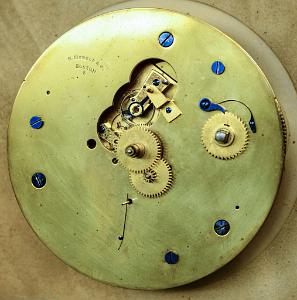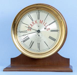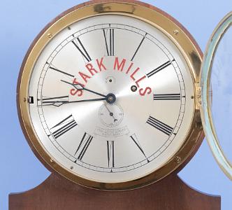 InformationClock - E. Howard & Co., Boston, Mass., for Stark Mills of Manchester, NH by way of the Star Brass Manufacturing Co. of Boston, Mass., "No. 69" style marine clock, round bronze case with mounting flange, 12 inch Arabic numeral silvered dial marked for Stark Mills in red, blued steel spade hands, signed, 8 day brass timepiece with lever platform, movement #5. Truly an insanely impressive clock for the Howard collector, the brass clock collector, or simply for the lover of Manchester, New Hampshire. CONDITION: Mvt: Running, excellent cosmetic movement condition overall, light tarnish to brass surfaces; restored silvered dial shows hardly any wear; excellent-plus blued steel hands; case shows little wear, mild spotty tarnish in areas, no dents or dings; good glass crystal. (CL0639) Note: History of Stark Mills.The buildings were constructed over an interval of approximately 75 years, from 1838 to 1915. At its height, the millyard complex represented the largest textile mill in the world, extending along both banks of the Merrimack River for more than a mile. The major portion, and that which this survey covers, was located on the eastern bank of the river.