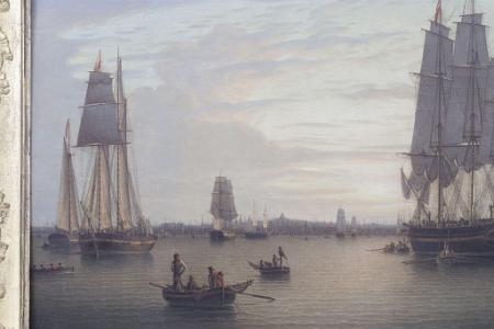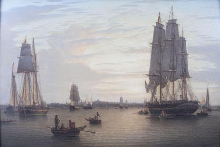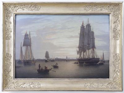 InformationOverse "Painted by Robert Salmon 1830" and numbered "647". "Robert Salmon Painter of Ship & Shore, Appendix A, Sil on board, "Boston and ship, sun sett maney Boats", circa 1830, signed "R Salmon" and titled and dated incursive on realmon's Catalogue of Paintings", p. 91, this manuscript of Salmon is reproduced in its original format. In this manuscript, Salmon wrote: "9 day. 24, 16 1/2. Boston and ship, sun sett maney Boats. 6 pounds". This Boston Harbor setting is shown at sunset depicting the end of the workday as dusk fills the sky. Salmon employs his characteristic figures here: the foreground features men anchored in a sailing skiff, one of whom is clad in Salmon's signature red shirt. Other typical elements: the scalloped ripples on the harbor form a perfect linear pattern; the ships in the busy harbor are rendered in the highest degree of details; and the State House stands on the horizon to identify the harbor as distinctly Boston. The inbound ship on the right with bustling crew on deck and her anchor hanging on the cathead ready to drop, is perhaps arriving from Europe. She is counterbalanced by the outward-bound topsail schooner at left, which is bearing down on the crew of competitive oarsmen entering the composition at far left. The scene, though filled with vessels and workmen, is tranquil; the warm sunset fills the sky with brilliant bands of yellow and pink light upwards from the horizon and reflects out across the water. In this work Salmon anticipates the boundaries of luminism with its bright glowing colors filling the sky. (PA1075)