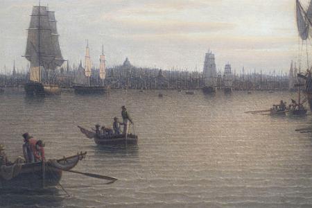 5/21/02 Phillips “Schooner with a View of Boston” 16x24 ($200-$250,000). Sold $508,500. Foster Collection.