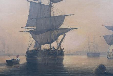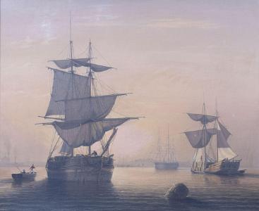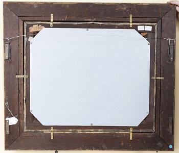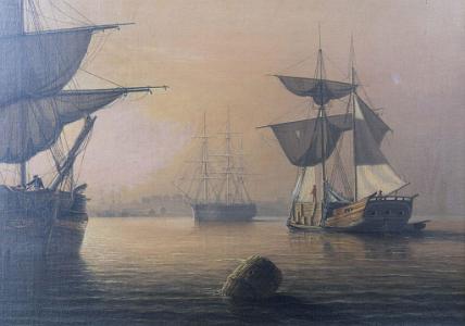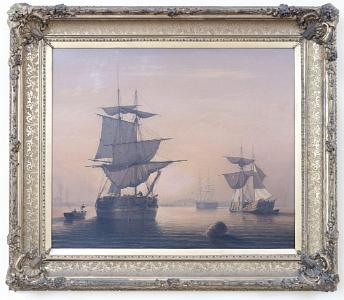 Information Fitz Henry Lane (1804 – 1865) Oil on canvas, “Boston Harbor with Ships Becalmed”, American, circa 1850. This broad view of Boston Harbor has all of the luminous qualities, one looks for, in a Fitz Henry Lane. From the horizon (left to right) one can view on shore buildings and other vessels. In the left foreground is a highly detailed brig coming towards the viewer at an angle with figures on board. The sails are in various stages of being raised or lowered. Given Lane’s father was a sail maker, it is no surprise that the sails are painted with meticulous detail. The sides of the hull are painted with a light band of color above the water line and the red anchor is being raised. To the left of the brig is a rowboat pulling up to the vessel with a standing sailor with a red shirt with a boat hook reaching towards another sailor on board the vessel with a red hat who is offering his assistance. Lane carefully painted the rigging in such a manner that each line that should have tension appears tight and all remaining appear loose as would have been appropriate to the wind conditions. To the far right is a heavily loaded lumber schooner with a standing figure with a red shirt on top of the planks. This schooner is under shortened sail. To the right of center near the horizon is a full rigged ship with all sails furled. The sky has warm orange and pink which becomes lighter and lighter until the sky becomes blue with a grid of color. This brilliant sky is reflecting in the water which is darkest at the foreground and lightens as it goes towards the shore. The waves are painted in gentle bands of rippling waves with highlights at the crest. Towards the middle of the water, there are burst of light reflecting from the sun. From the center of the sea to the horizon has various shades of brilliant color and the shadows around the vessel are highly realistic. American luminous paintings from 1830’s to 1855 ideally should portray a calm and peaceful moment in time. (PA1080) Provenance: Collection of George Lewis Condition of Painting: Painting retains original stretcher and has been lined. There are only a few minor scattered dots of in-paint with minor scattered frame abrasion. In the upper left sky are a few areas of old in-paint in which pigment has turned a whitish gray. Condition of Frame: Each of the corners have a beautiful carved leaf and flower decoration as well as the circumference at top edge. The cove of the frame has a “leopard-skin” style decorative pattern. There is a plain ¾ inch reveal liner. There are a few minor scattered losses to the moldings. This period frame has a wonderful gold-leaf surface with warm rich patina. Dimensions of Painting: Height 25 inches; Width 30 ¼ inches. Dimensions of Frame: Height 34 ½ inches; Width 39 ½ inches. Note: There are three labels on reverse stating: Museum of Fine Arts, Lewis Collection. Also, in the upper left is a handwritten remnant of an old jelly label: …Bradford, 220 Beacon St. Reference: Wilmerding, John, “Paintings by Fitz Henry Lane”, published by the National Gallery of Art, Washington D.C., 1988. Similar luminous Boston Harbor paintings appear in this catalog – Pages: 24, 25, 54, 55, 56. Lane Auction Records: 4/19/2023 Sotheby’s 20x30 “Bar Island and Mount Desert” ($ 1,000,000 - $ 1,500,000). Sold: $6,079,5000. 8/24/2016 James Julia 20x30 “New Bedford Harbor” Sold: $ 296,250. 11/19/2004 Bonham’s/Skinner 24x36 “Manchester Harbor” Sold: $ 5,506,000. 5/25/2000 Christy’s 24x36 “The Golden Rule” Sold: $ 3,966,000. 03/20/2013 Bonham’s/Skinner 13x22 “View of Camden Harbor from the Graves” Sold: $ 1,384,000. Lane Auction Records (continued) 05/09/1997 Bonham’s/Skinner 30x48 “View of west Beach Beverly” Sold: $ 3,200,000 Price: $ 3,200,000