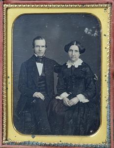 InformationQuarter Plate Daguerreotype of a Man and Woman, pictured seated with the man's arm around her. Gilt accented jewelry. Embossed velvet case interior with "Brady's Gallery 359 Broadway New York". The date 1858 appears on the velvet on the left side of the case. The image is well composed and is very crisp and sharp deserving the reputation of Mathew Brady probable the most famous of all American daguerreotypist. The dag has its original push button case opener with fancy star pattern that matches on both sides. The top borders of the case have gilt pattern that runs around the borders. (PH0463)