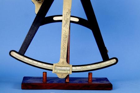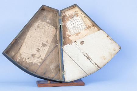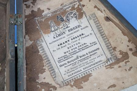InformationEbony Framed Octant with Engraved Radius arm with two peep sites. The Instrument retains its original step down painted Box with the label of Aaron Breed of Boston. "EJ Marsh Balitimo." is hand painted in a circle with a painted five pointed star at its center. There is a hand painted American Flag at the top section of the box., The box retains its original fancy key escutcheon mounted on the side of the box.circa 1790. (I 1001) Condition of Quadrant: The Quadrant is complete and is in good condition. The box top is made from three pieces which have had age separation. Dimensions of Box: Height 17 1/4 Inches Dimensions of Quadrant: Height 16 1/4 Inches