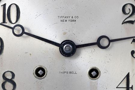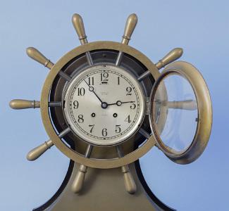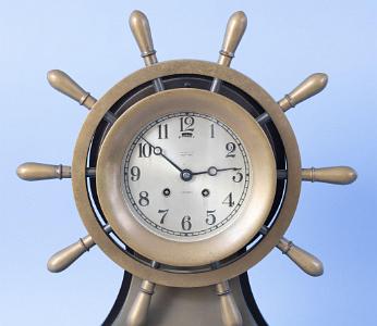 InformationChelsea 6-inch Mariner Sip's Wheel clock, Boston, Circa 1970. The clock has an engraved silver dial with Arabic numerals. The dial is engraved: "Tiffany and Co. New York and "SHIP'S BELL". The clock has patinized bronzed brass case with a ten spoke ship wheel around it. The clock sits on a bronzed base. The back and bottom of the base are mahogany. The clock retains the original Chelsea eight-day time and strike movement which is numbered: "164736",
