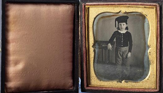 InformationSixth Plate Daguerreotype of a Young Child Dressed in a Sailor's Outfit. The young boy in the photo has shoulder length hair and is wearing a sailor-like period hat with a ribbon on the side. The dag is very crisp and the facial features appear very clear with the subtle hand coloring of the checks. The child is leaning on a spooled legged 1850s period table. The dag retains its original sixth plate mat and leather case. (PH0468)