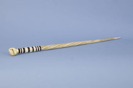 InformationOutstanding and rare whaler-made clenched fist narwhal walking stick, early 19th Century, with a whale ivory clenched fist knob, foreshaft with 15 alternating baleen and narwhal spacers.. (WS0260)