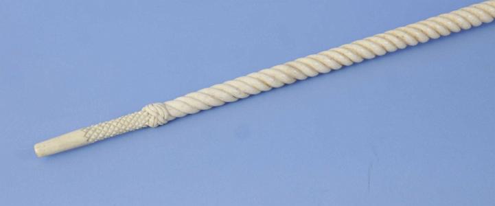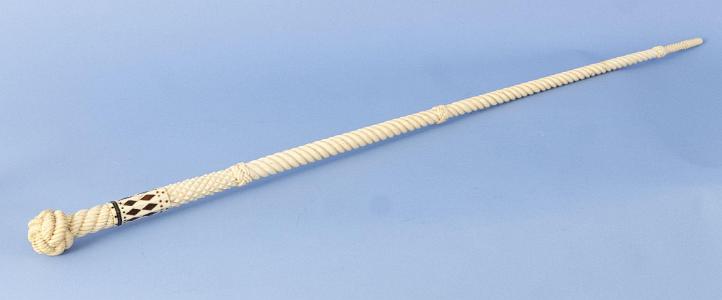 InformationOutstanding whale ivory, whale bone, tortoiseshell and baleen cane, American, mid-19th century. There is a finely carved monkey fist grip above a rope turned whale ivory grip. Below is a baleen spacer with an eight-sided section of whale ivory with two diamond tortoiseshell inlays on each of the eight sides. There is a long tapered whale bone shaft divided into four sections. The top section has high relief diamond hatch carving above a Turk's-head; this is followed by a rope carved section ending with another Turk's-head; then another section of rope carving ending with a Turk's- head. The final section has a tiny hatch cut section with a final section of smooth polished bone. (WS0262)