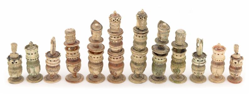 InformationPrisoner-of-war carved bone chess set, French/English, circa 1810. This is a complete set of 32 chessmen, 16 stained red and 16 stained green. Each piece, save the knights and rooks, have figural heads or busts atop footed bases carved with crosshatch and circle designs. The detail of the heads and faces of each piece is excellent. All of the pieces sit on turned bone bases and have carved and pierced fine details. Knights and rooks have matched footed bases and the appropriate stylized horse head and castle turret. (SC 1320) Condition: The set is generally in good condition especially for something older than 200 years. Except for the knights all the pieces have small ball finals above the head and several are lacking. There are scattered losses to some of the edges of the various pieces.