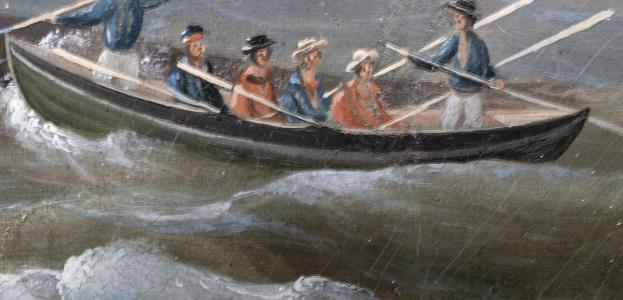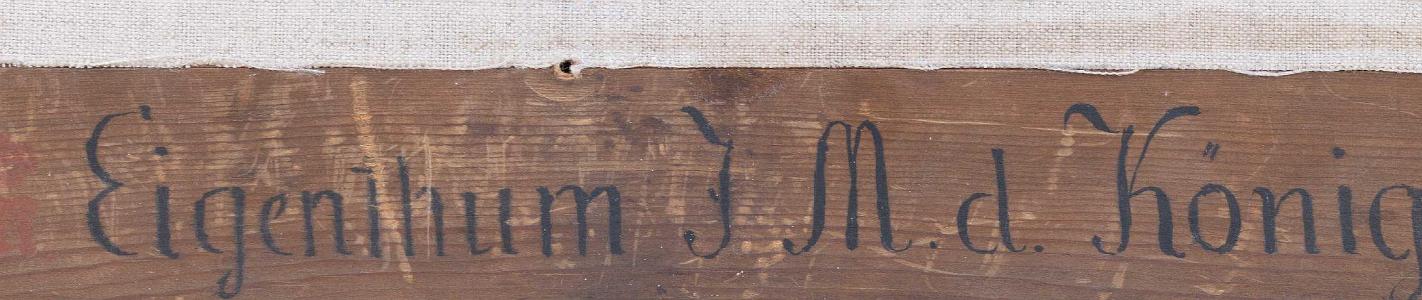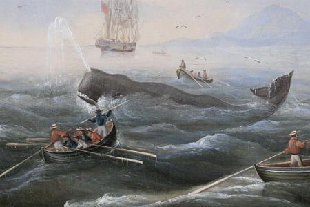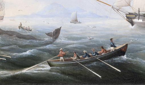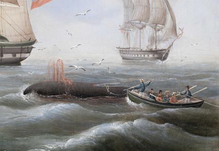 Oil on canvas, titled "Whaling in the South Seas" signed and dated lower right "CJ Fedeler Pinx 1843". Hand printed and labeled on the reverse "Eigenthum J.M.D. Konigin". The painting depicts an active whaling scene with a whaleboat with whalemen facing towards a sperm whale about to harpoon the whale. Beyond the whale is another whaleboat and a ship further in the distance. Just to the right is another whaleboat with colorfully dressed whalemen, one with harpoons at the bow and another at the stern holding the steering oar.