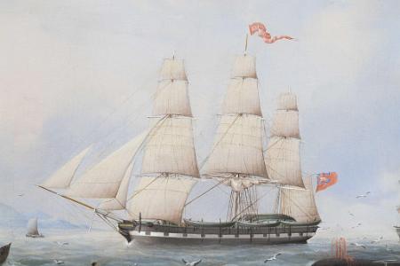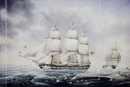 Note: A very similar painting was illustrated on the cover of The Richard Bourne Auction catalogu, dated August 1 and 2 August 1978. The painting was listed as Lot 671 and states "The painting depicts the American Whale Ship Trident of New Bedford and was signed C.J. Fedeler 1846".