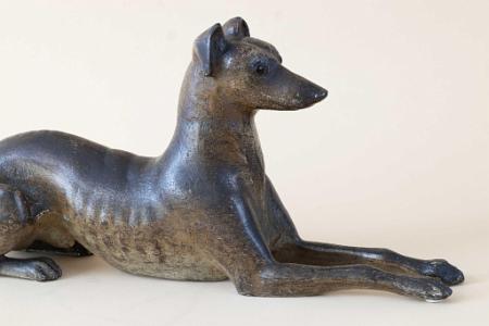 InformationExceptional and rare cast iron doorstop featuring a reclining whippet dog with head up and front legs extended with paw details on the feet. The dog is presented with amazing anatomical accuracy. The head is thin and long with pronounced aye brows and set in glass eyes. The ears are mounted to the back of the head and are in an upright position. Below the neck is the chest and ribcage with exposed ribs along the bottom. The dog’s waist is very narrow, and he is sitting on his haunches. The dog’s long tail spins around with an open loop and continues up the dog’s back and ends on top his left haunch. The dog’s rear legs and feet are shown in a seated position, and the rear paws have articulated claws. The Doorstop retains a light and dark mottled surface. The color and tones are lighter under the dog’s ribs and belly. (FA1198)