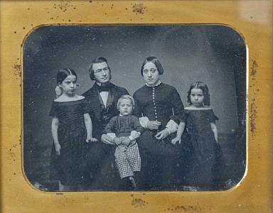 InformationFull plate daguerreotype of a family of five attributed to Southworth and Hawes Boston circa 1850. The daguerreotype retains its original molded frame. The dag shows the seated parents seated in the middle with a young son on the father's lap. There are two girls standing on opposite sides of the parents Everyone is dressed in their Sunday best. The image is of high quality and very sharp. (PH0471)