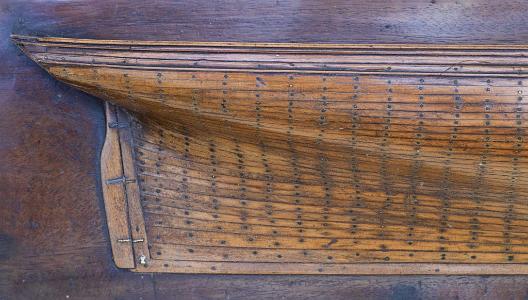 The mahogany applied ball works moldings are applied above the deck line and below ar are individually applied and metal fastened moldigs of above about 30 rows of hand applied plands with hand applied metal fasteners. There is applied mahogany keel that raps the hull. There is an applied bowsprit knee and figurehead below the snub bow sprit. At the stern there is an applied rudder with brass gudgeons and pintals. The model is attached to its original mahogany backboard.