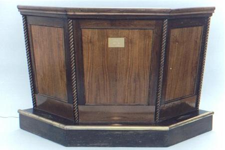 InformationRosewood bar from the yacht Ranger, American, circa 1910. The bar is constructed of three panels, each separated with a carved rope panel and each end has a carved rope panel as well. At the bottom of each of these panels is a six inch copper kick plate. Around the base of the bar is a foot rest which comes out seven inches and is trimmed at its edge with brass. The top surface of each panel has a diamond cut-out with red and green clear bulbs, when lit the bar is open for service. The top service of the bar is a single sheet of copper which is original. The back of the bar has locking hinged cabinet and a variety of shelves. Early American yacht furniture and furnishings are extremely rare. (F-136)