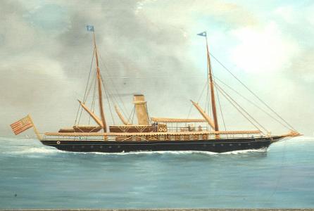 Note: The steam yacht, "Sylvia", was built in 1882 in Glasgow by A. Stephen & Sons and belonged to Edward M. Brown. Mr. Brown was a member of the New York, Atlantic and Larchmont Yacht Clubs. Sylvia was 146 feet in length, 18.5 in breadth and 10 feet in draft. Dimensions of Painting: Height 17 3/4 inches; Width 31 3/4 inches.