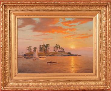 InformationSheppard, Warren W. (American 1858-1937) Oil on canvas, depicting a sunset off the New England coast (probably the Connecticut shore off Long Island Sound), signed lower left: "Warren Sheppard", circa 1900. At the center of the painting, there is a spit of land which is possibly an island but probably a peninsula. To the right of the land is a large mansion, to the left a barn and to the far left an outbuilding - clearly, a wonderful estate. The water is very calm. Left of center is what looks like a Herreshoff launch with two figures. Beyond the launch is a white hull yawl with her mizzen sail raised and a small dory trailing behind. There is a second blue hull yawl with a raised mizzen. Both yachts have a few figures aboard. The painting has a wonderful calm and tranquil spirit. (PA-545)