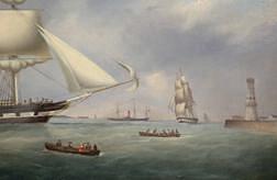 Oil on canvas attributed to the Enlish artist John Huges of the American clipper ship, 'Samuel Lawrence', circa 1855. A similar painting attributed to Francis Huswick is illustrated in the new Sam Davidson book. This colorful and spirited work depicts the three masted ship, 'Samuel Lawrence' preparing to depart Liverpool for Boston Harbor. The name, 'Samuel Lawrence', appears on the bow and stern quarterboard. Sam Davidson further points out that the location is in the Mersey River, the artist having his back to Liverpool and looking towards the Mersey entrance. The Perch Rock fort and lighthouse at New Brighton is visible on the horizon beneath the ship's bowsprit. The tower on the right is the Victoria Clock Tower marking Salisbury dock. This is a very rare view of which there is only one other known example. The five signal flags flying from the rear mast confirms the ship's identity as the 'Samuel Lawrence'. The 'Samuel Lawrence' was named after the Massachusetts-born revolutionary. The ship was built in Medford, Massachusetts in 1851 by Paul Curtis. Initially this ship made several notable passages from New York to California. From 1855 until 1858, the ship was classified as a Boston to Liverpool packet transporting mail, cargo and passengers from the Boston agent, Warren and Thayer. In 1862, the 'Samuel Lawrence' was sold to British owners and renamed, 'Vanguard', in order to escape Confederate raiders. The vessel is shown hove to with a launch pulled up unloading passengers. To the right are two additional launches carrying passengers to the ship. The launch in the foreground has aboard a woman in a bright red dress. To the left of the clock tower is a second bow on view of the 'Samuel Lawrence' sailing towards the viewer. The painting has brilliant color as well as an interesting level of activity. (PA-575) Condition of painting: Refer to document folder for full condition report. Condition of frame: The painting has a contemporary nineteenth century style fluted-cove frame with a 23 karat gold surface.