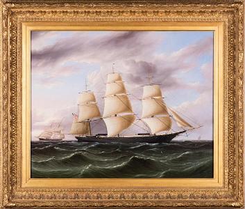 Exceptionally rare and important canvas, depicting the American clipper ship, 'Black Warrior', signed lower right: 'J E Buttersworth', American, circa 1853. This painting is executed in Buttersworth's typical fashion. The hull is beautifully detailed showing each plank. The lighting on the hull is also exceptional in the manner it captures light reflection. The figurehead is very detailed and depicts a woman with outstretched arms. A quarterboard with the name 'Black Warrior' is crisply painted along the bow and in front of the anchor and a second quarterboard is mounted below the lifeboat. The stern decoration is also visible. There are several figures onboard. The deckhouses and lifeboats are very detailed. The sails have outstanding detail and shape. The sail seams and reef points are accurately delineated and are remarkably well preserved. The spars are also beautifully drafted and the stunsails are visible from the lower three yardarms on the front two masts. Flying from the peak of the main mast is a white flag with a red, white and blue American shield. The American flag is flying off the gaff. To the left of the 'Black Warrior' is another clipper ship flying an American flag. This vessel is under shorten sail and is flying a house flag from the peak of the main mast with a white ground and a red cross with a blue dot at the center of the cross. The water is typical of Buttersworth paintings of this period. The rolling waves are painted very accurately with white detailing at the crest of the waves and white detailing along the hull. The sky is also typical with puffy clouds with the pink and purple highlights. The color saturation and brightness of color is exceptional in this painting. Many of the Currier & Ives clipper ship prints painted by James Buttersworth are extremely similar to this painting. (PA-603)